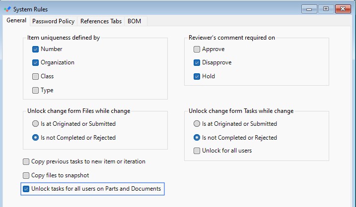 New System Rules setting Unlock tasks for all users on Parts and Documents. This allows all users to assign tasks and delete tasks they assigned on Pending revisions.