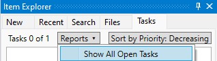 TaskList reports are available in the Tasks pane in Item Explorer. User transforms with TaskList as Location appear in the Reports drop-down list on the Tasks tab, enabling task views by priority or other criteria. [e80464]